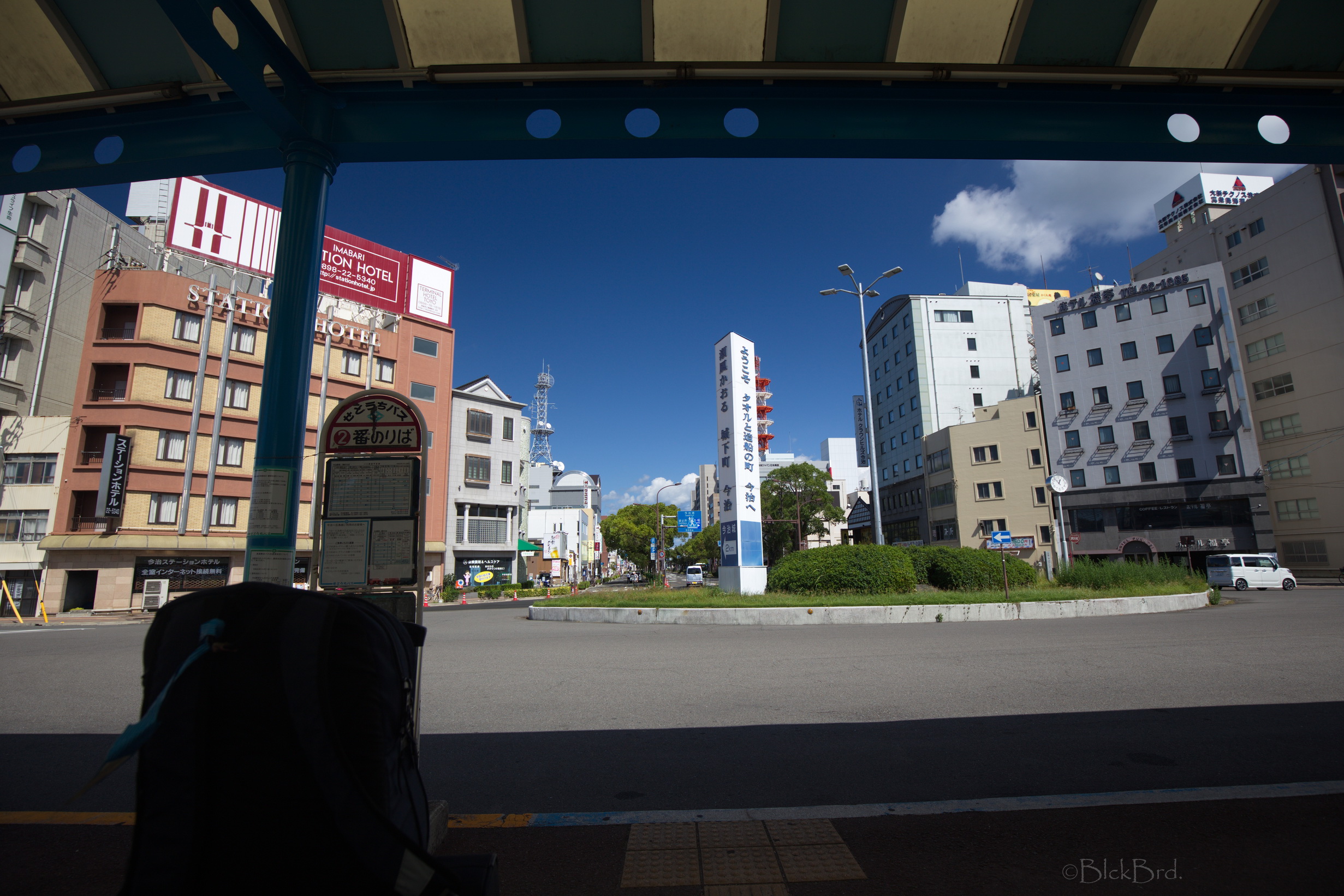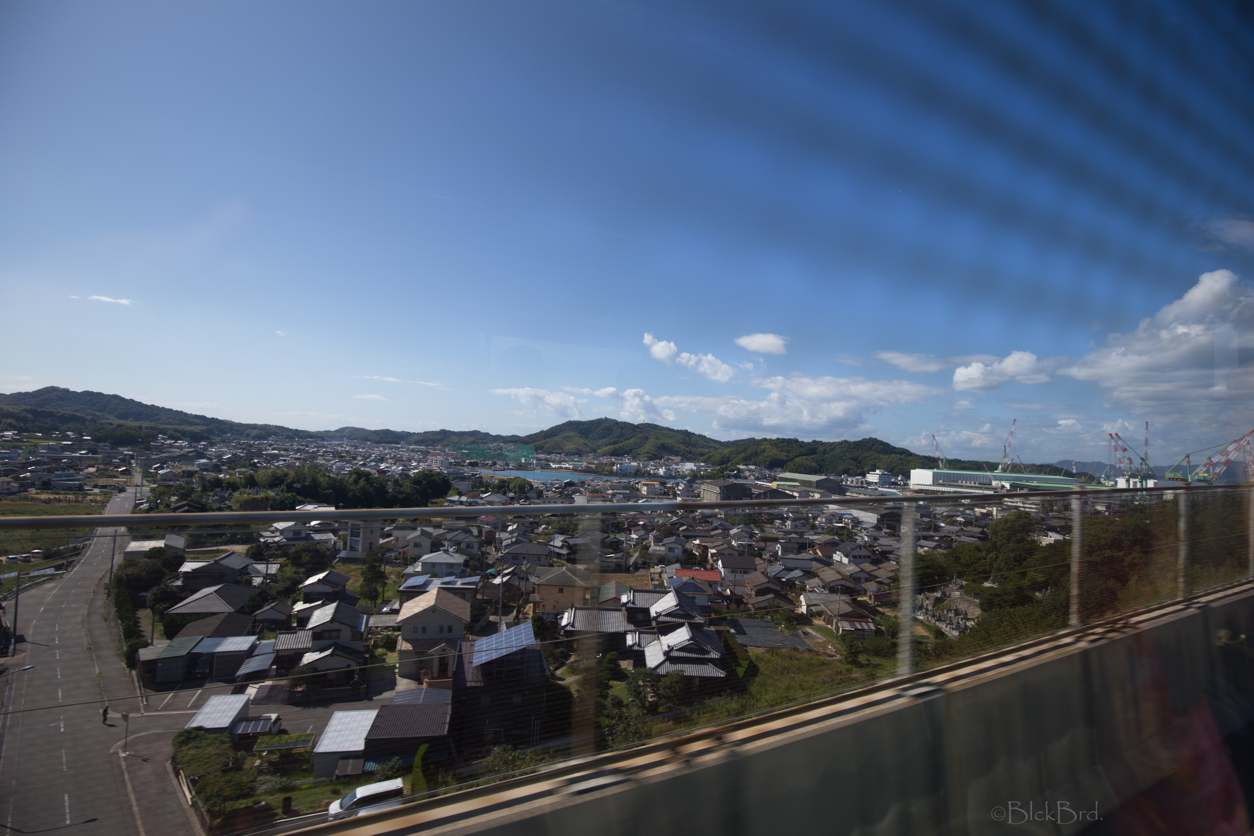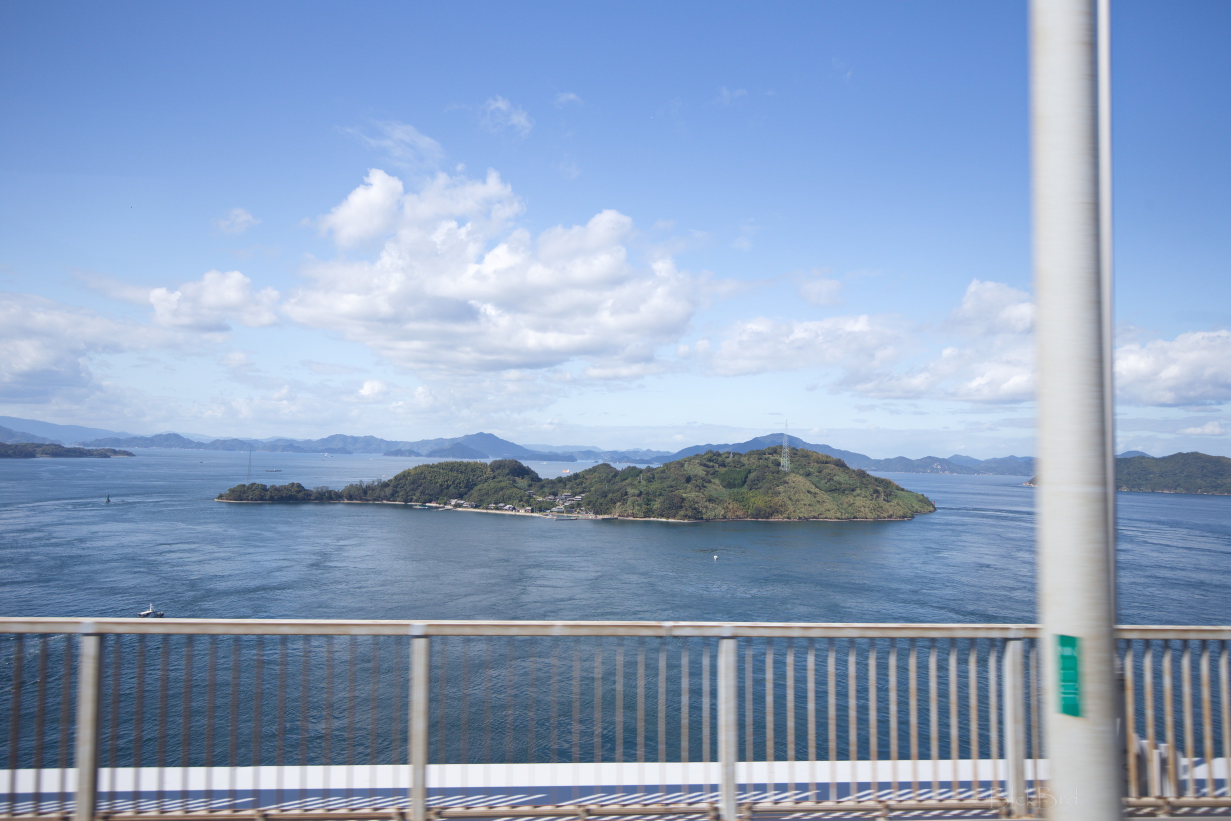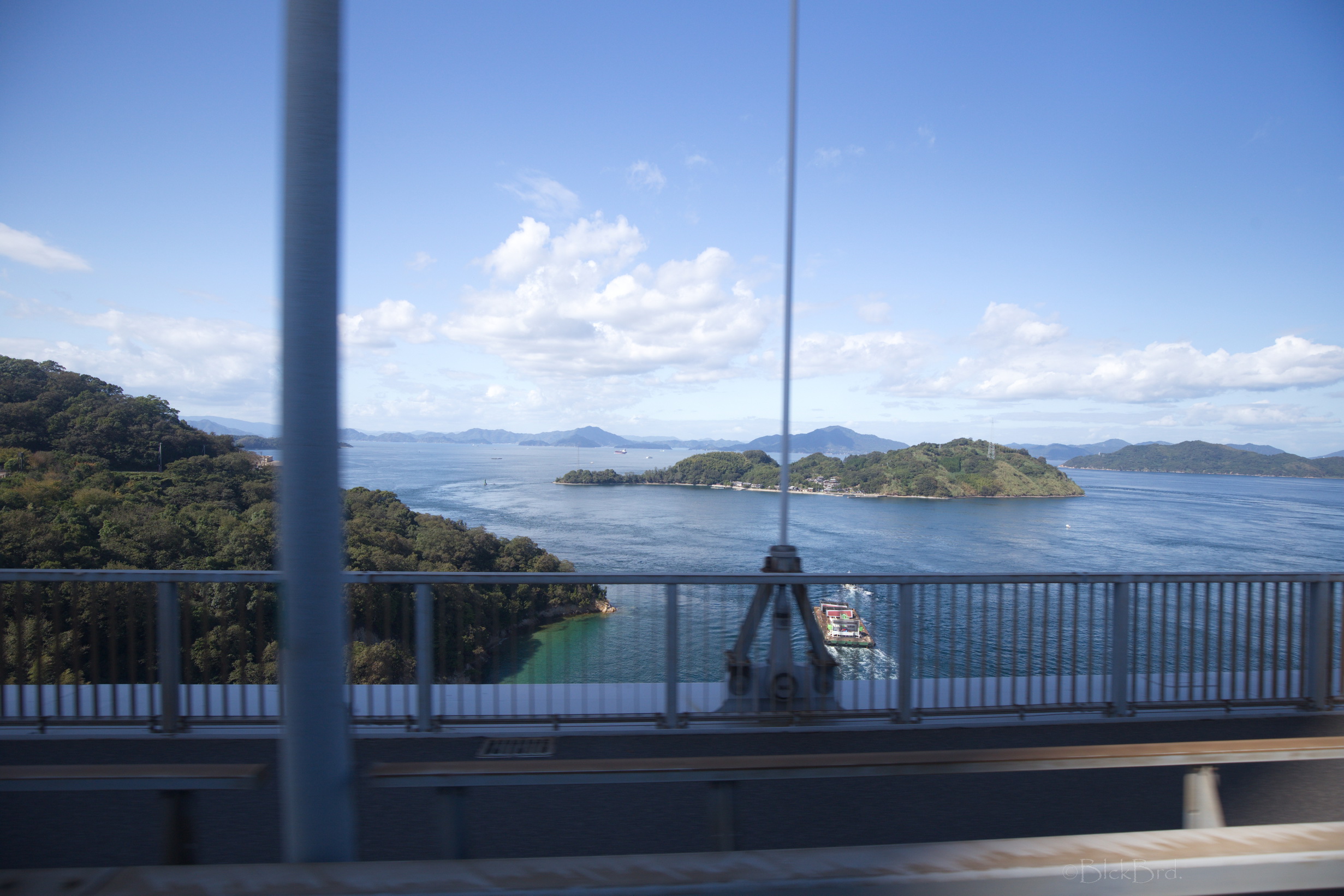 Le train remonte de la vallée du Yoshino en crue vers le nord. Un changement à Tadotsu. Puis on longe les terres, ou la mer :)?, vers l’ouest jusqu’à Imabari. Là, face à la gare, on choppe le bus qui traverse les îles de la mer de Seto vers le nord jusqu’à Hakatajima, l’île où on a décidé de crécher.