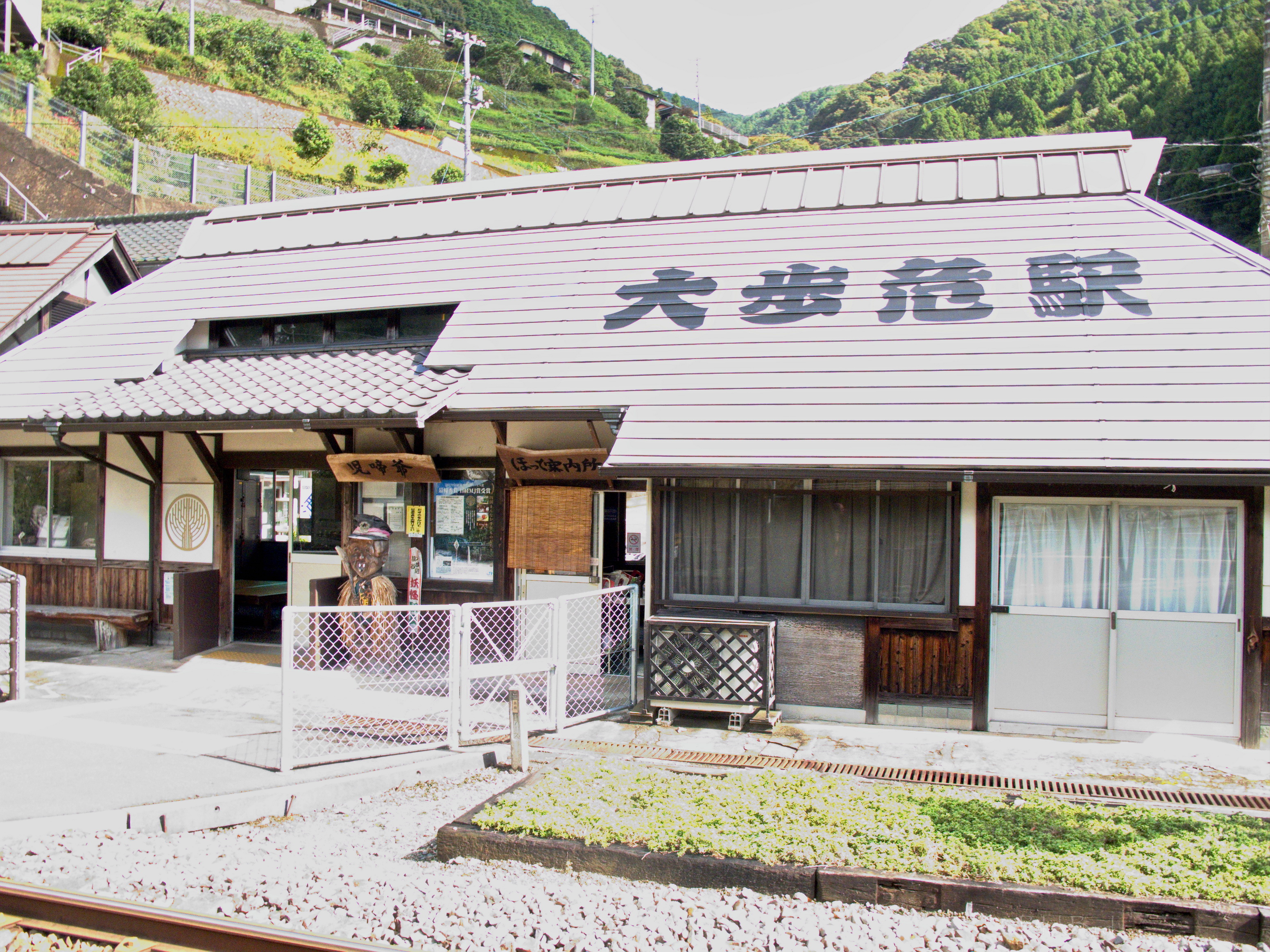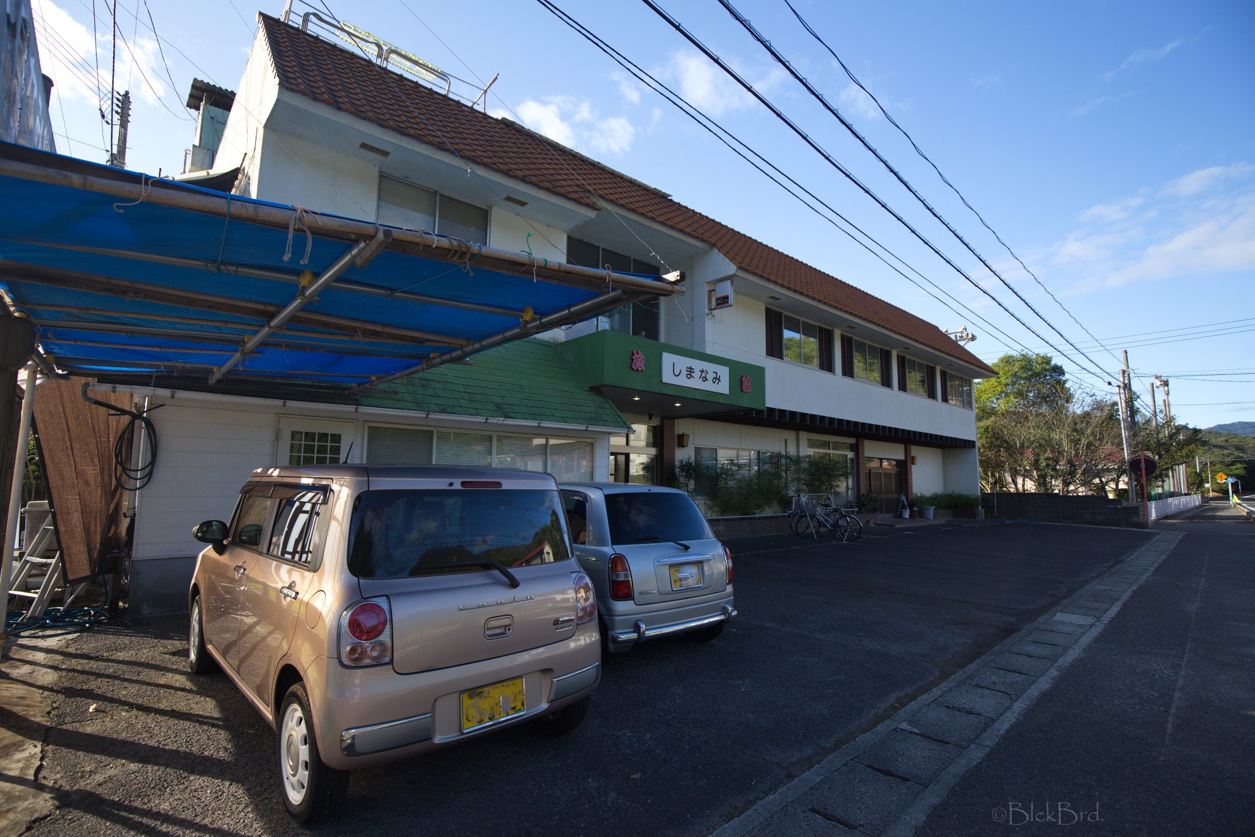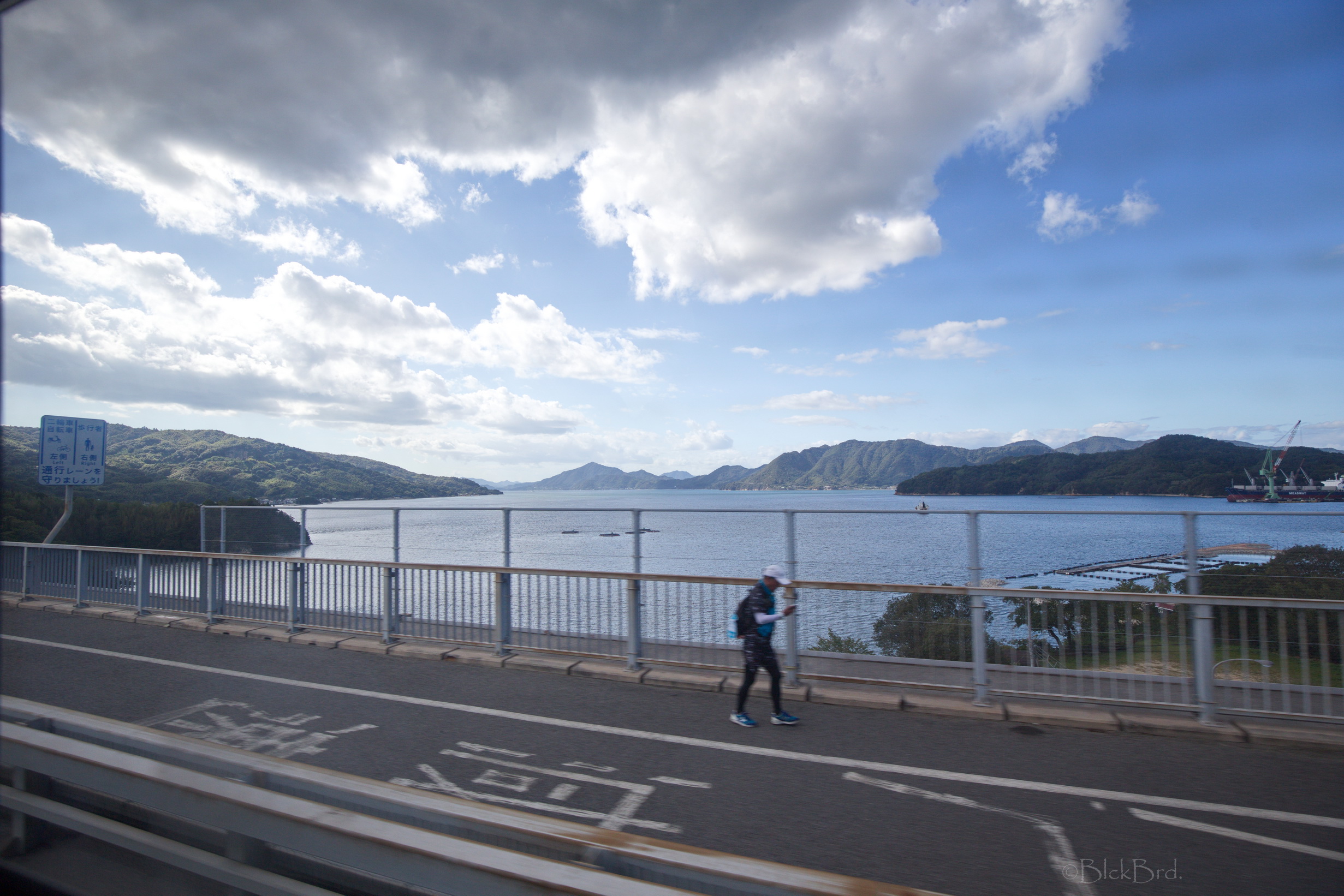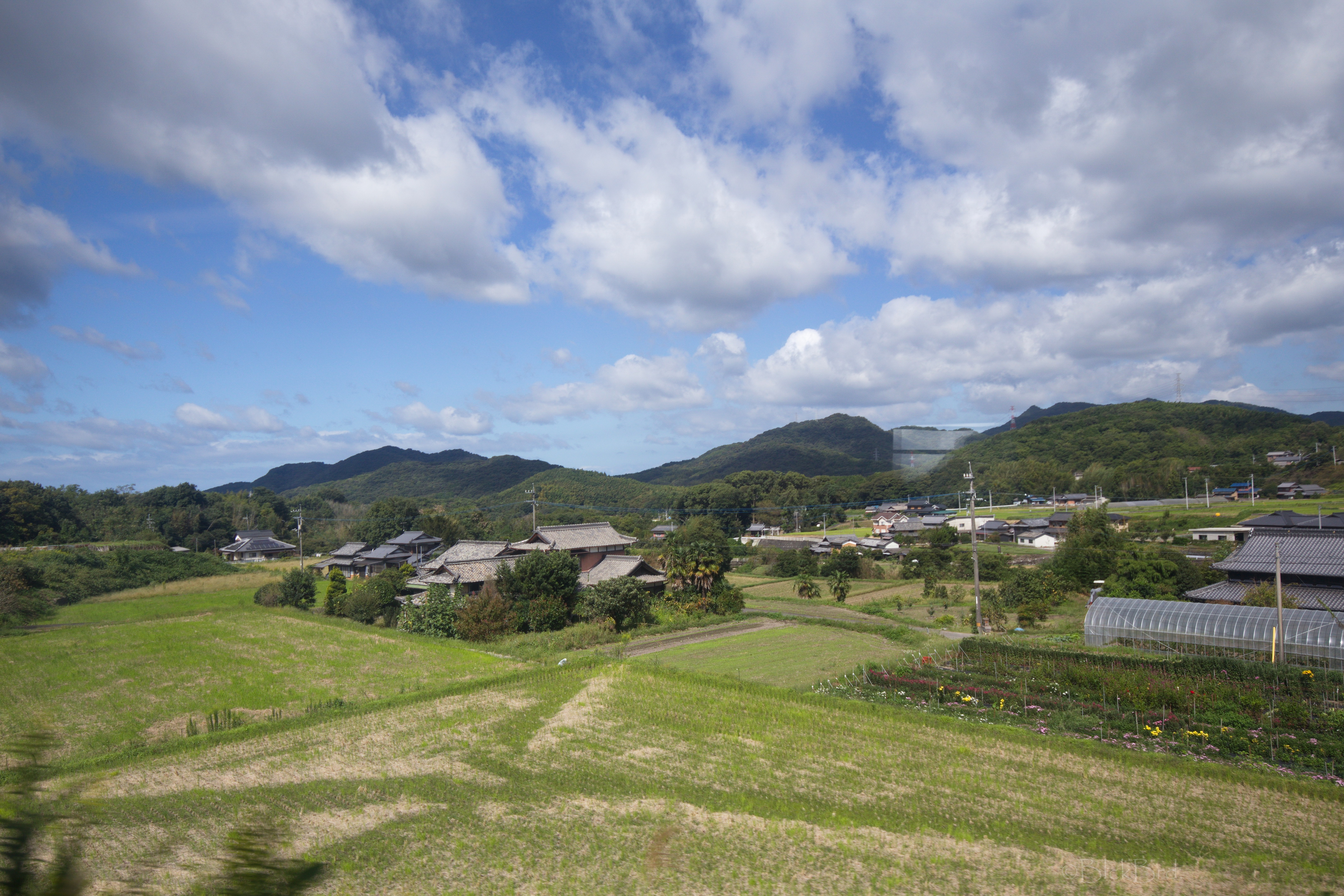 Le train remonte de la vallée du Yoshino en crue vers le nord. Un changement à Tadotsu. Puis on longe les terres, ou la mer :)?, vers l’ouest jusqu’à Imabari. Là, face à la gare, on choppe le bus qui traverse les îles de la mer de Seto vers le nord jusqu’à Hakatajima, l’île où on a décidé de crécher.