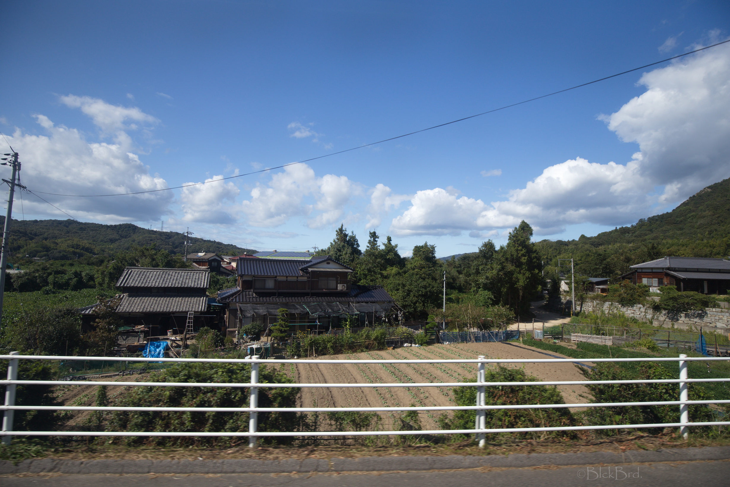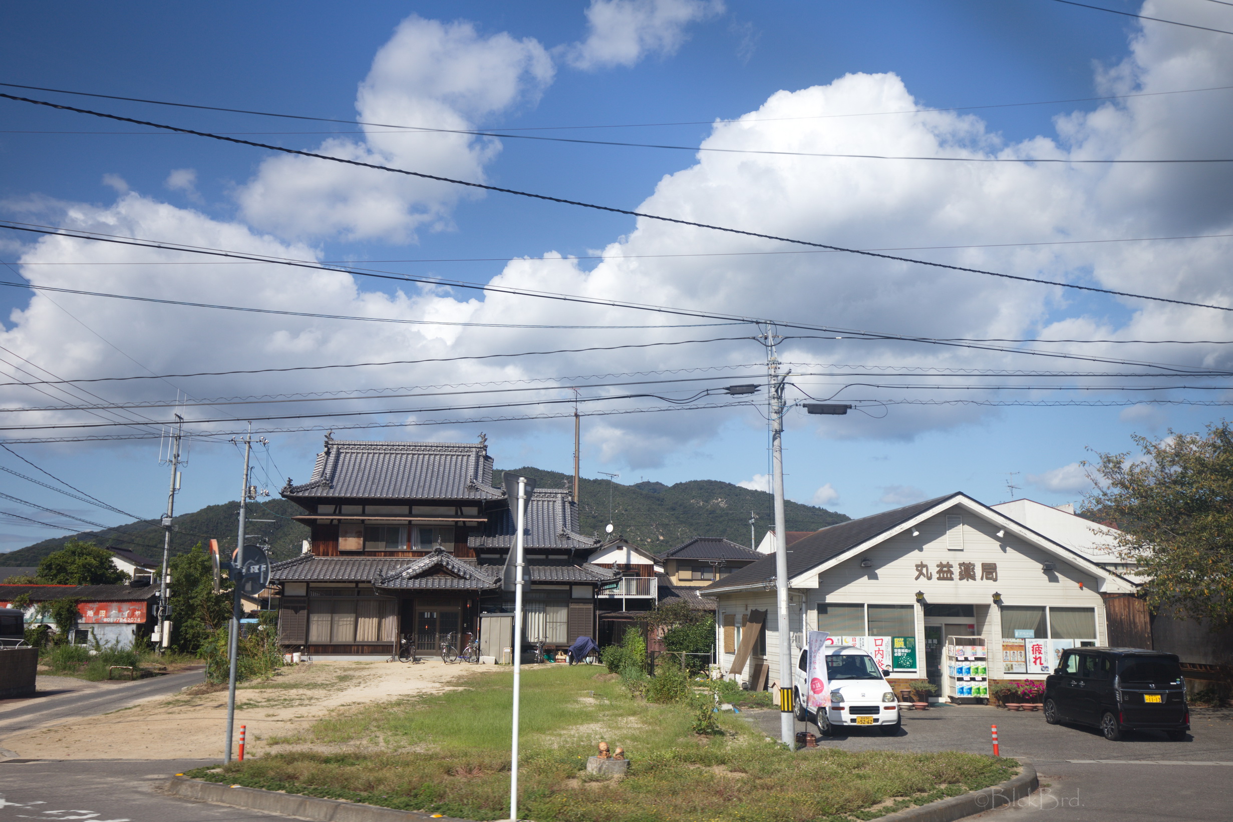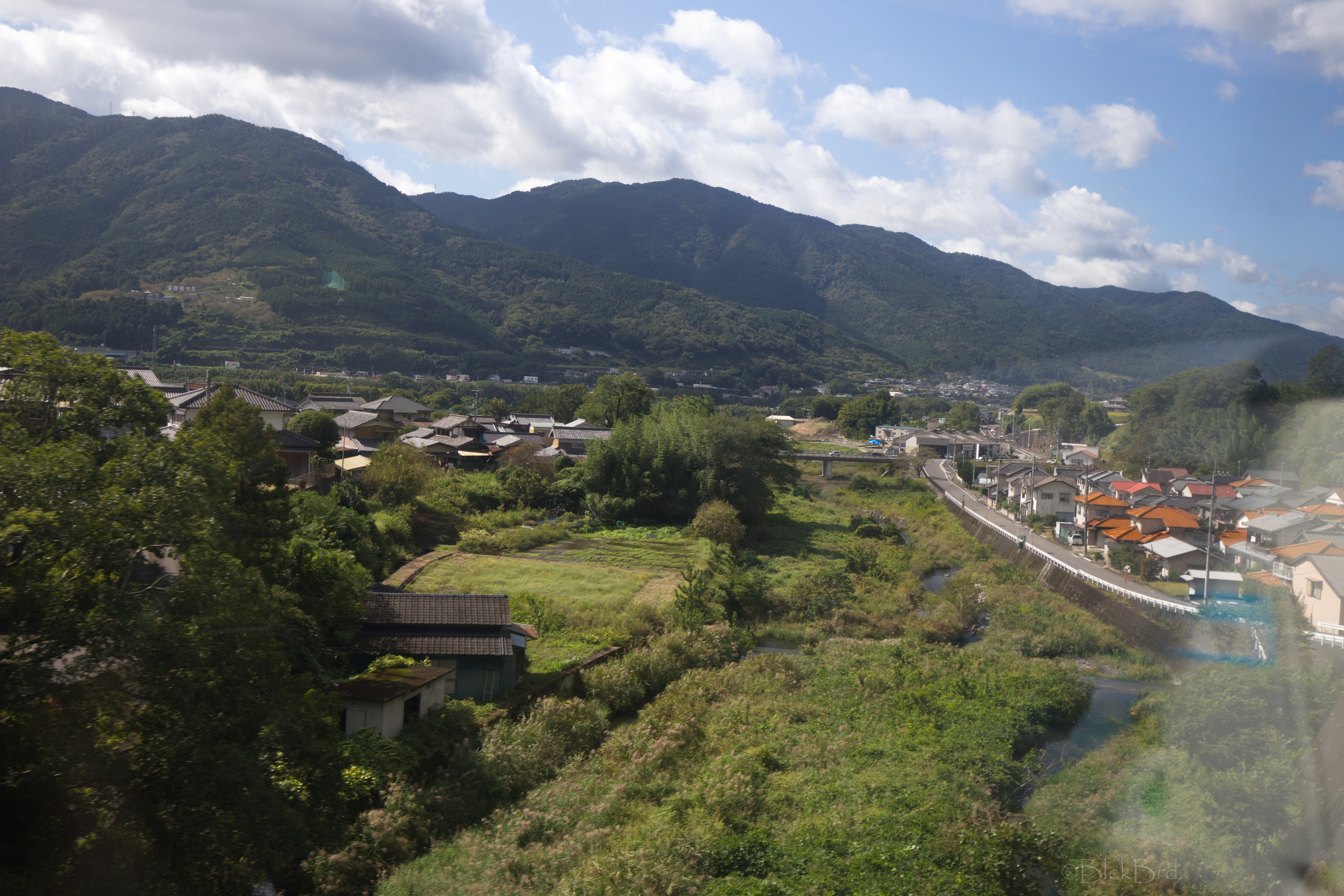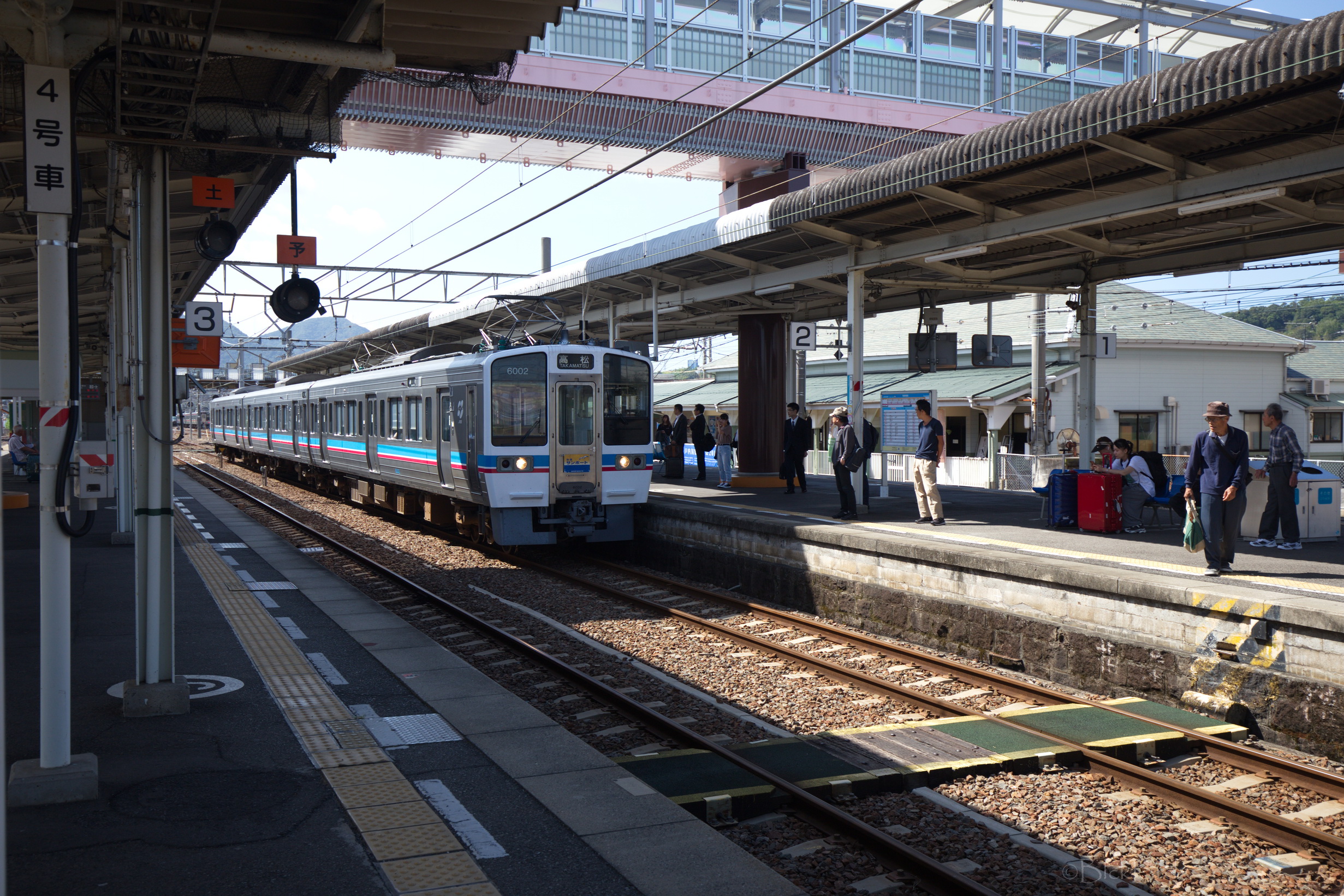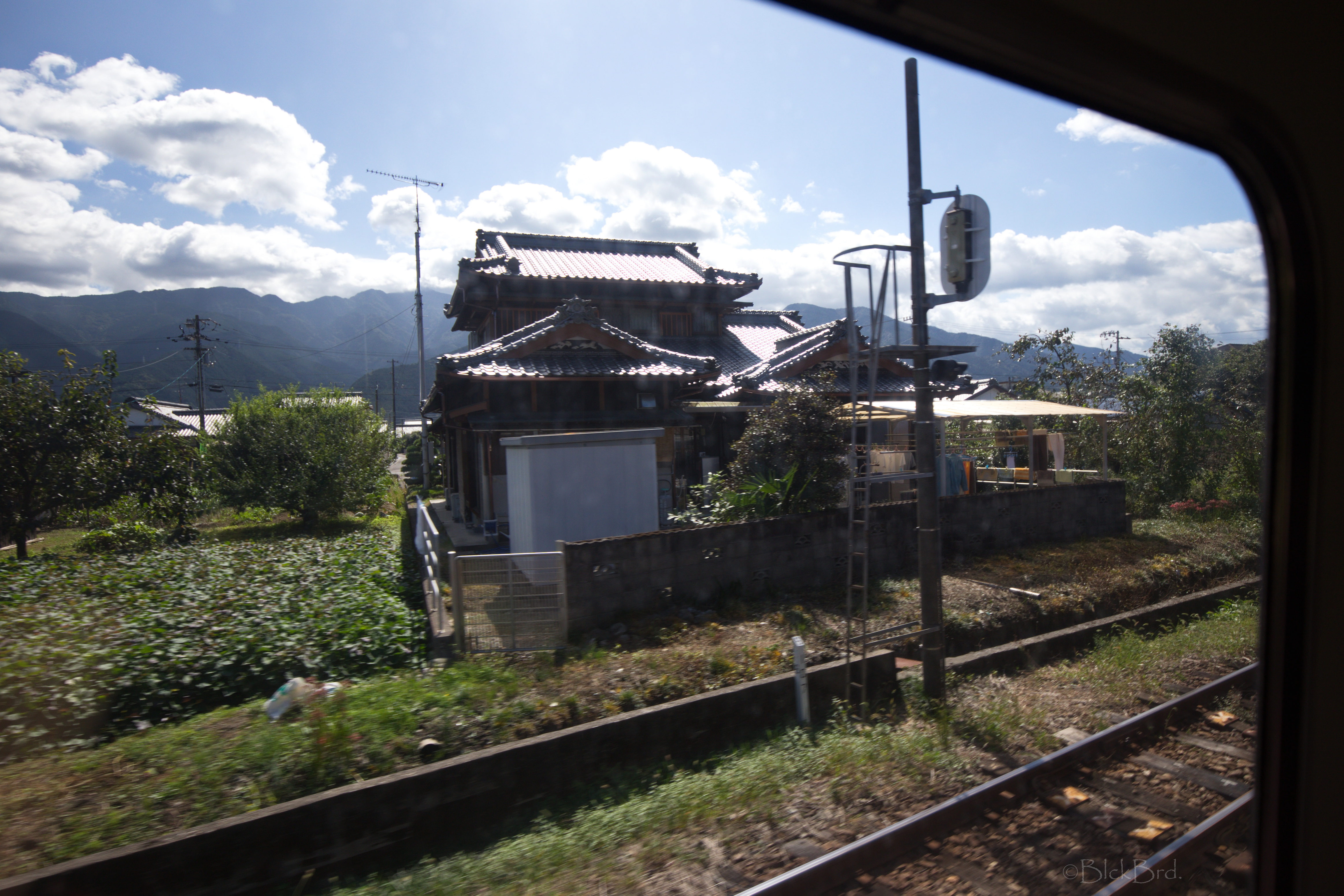 Le train remonte de la vallée du Yoshino en crue vers le nord. Un changement à Tadotsu. Puis on longe les terres, ou la mer :)?, vers l’ouest jusqu’à Imabari. Là, face à la gare, on choppe le bus qui traverse les îles de la mer de Seto vers le nord jusqu’à Hakatajima, l’île où on a décidé de crécher.