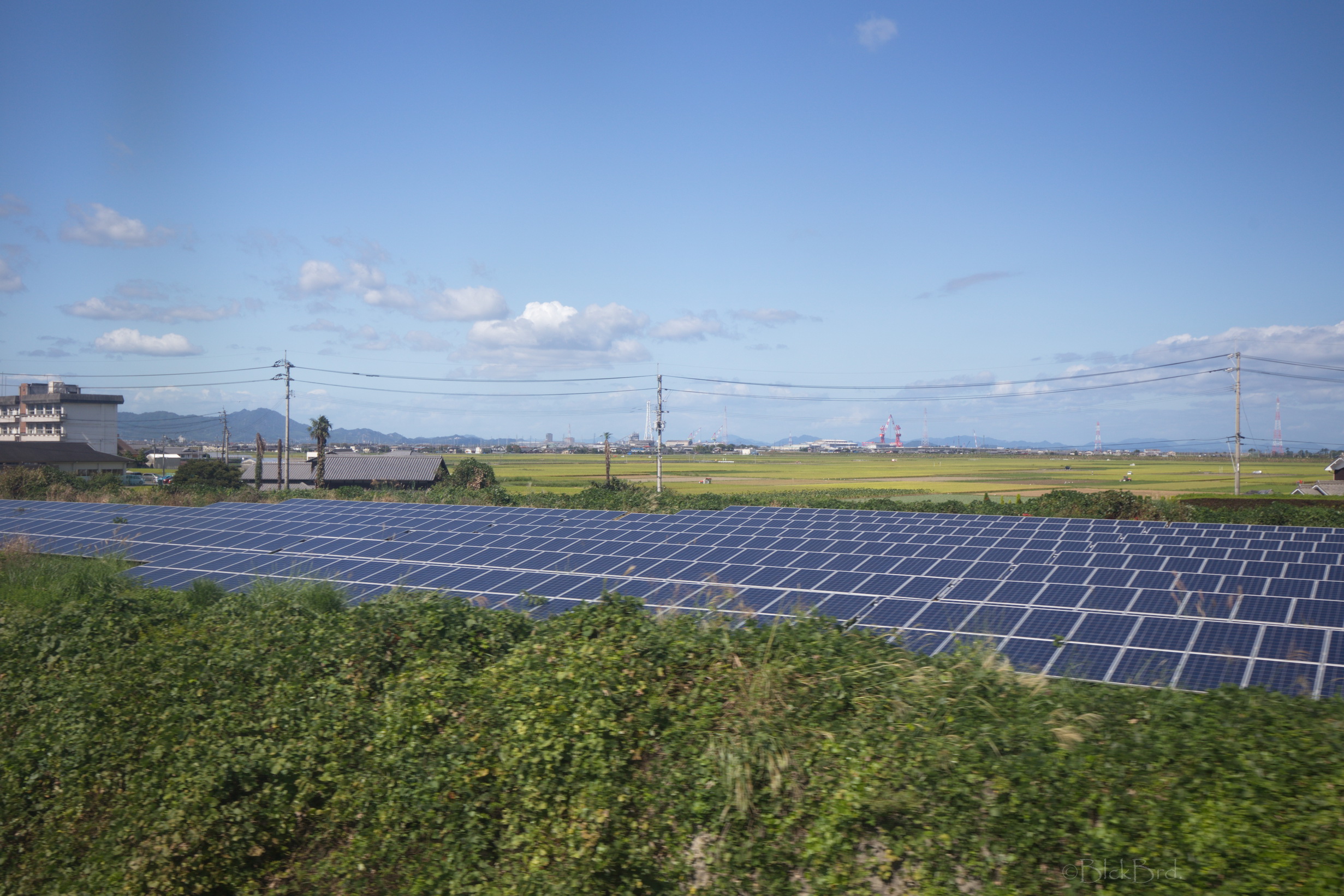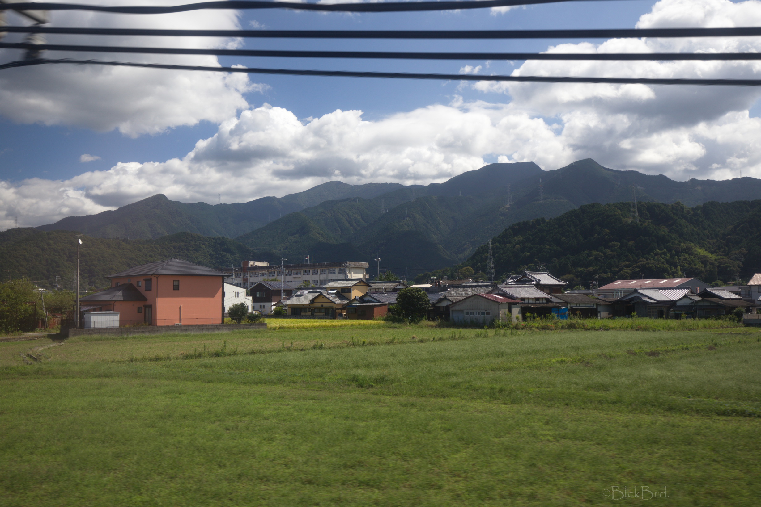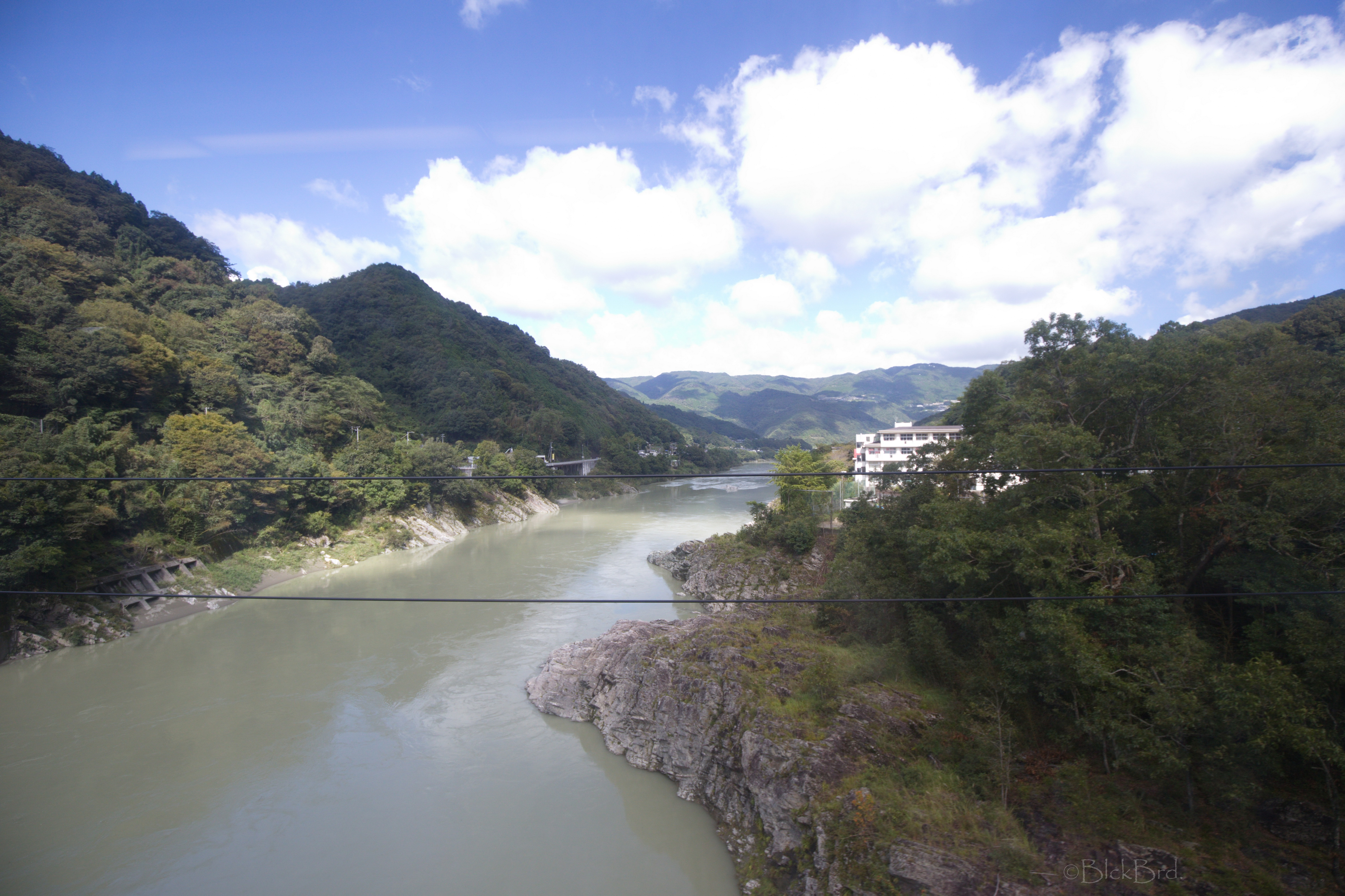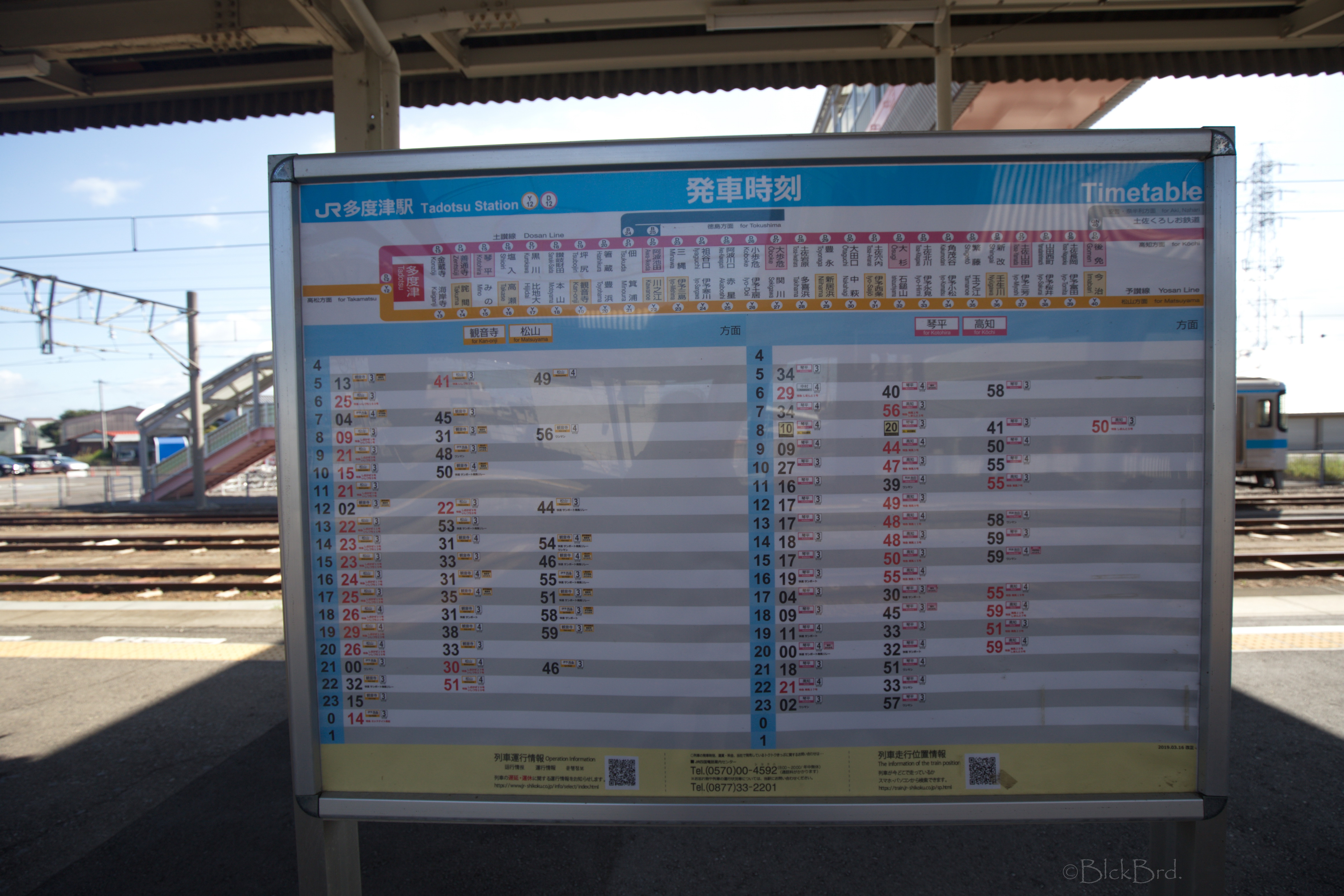 Le train remonte de la vallée du Yoshino en crue vers le nord. Un changement à Tadotsu. Puis on longe les terres, ou la mer :)?, vers l’ouest jusqu’à Imabari. Là, face à la gare, on choppe le bus qui traverse les îles de la mer de Seto vers le nord jusqu’à Hakatajima, l’île où on a décidé de crécher.