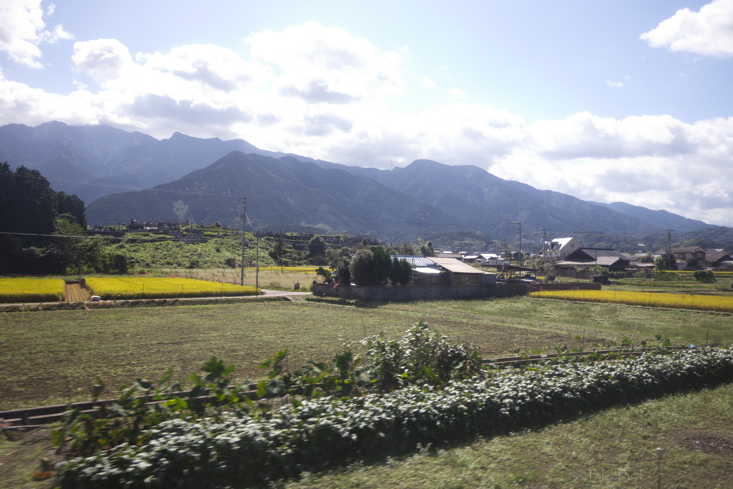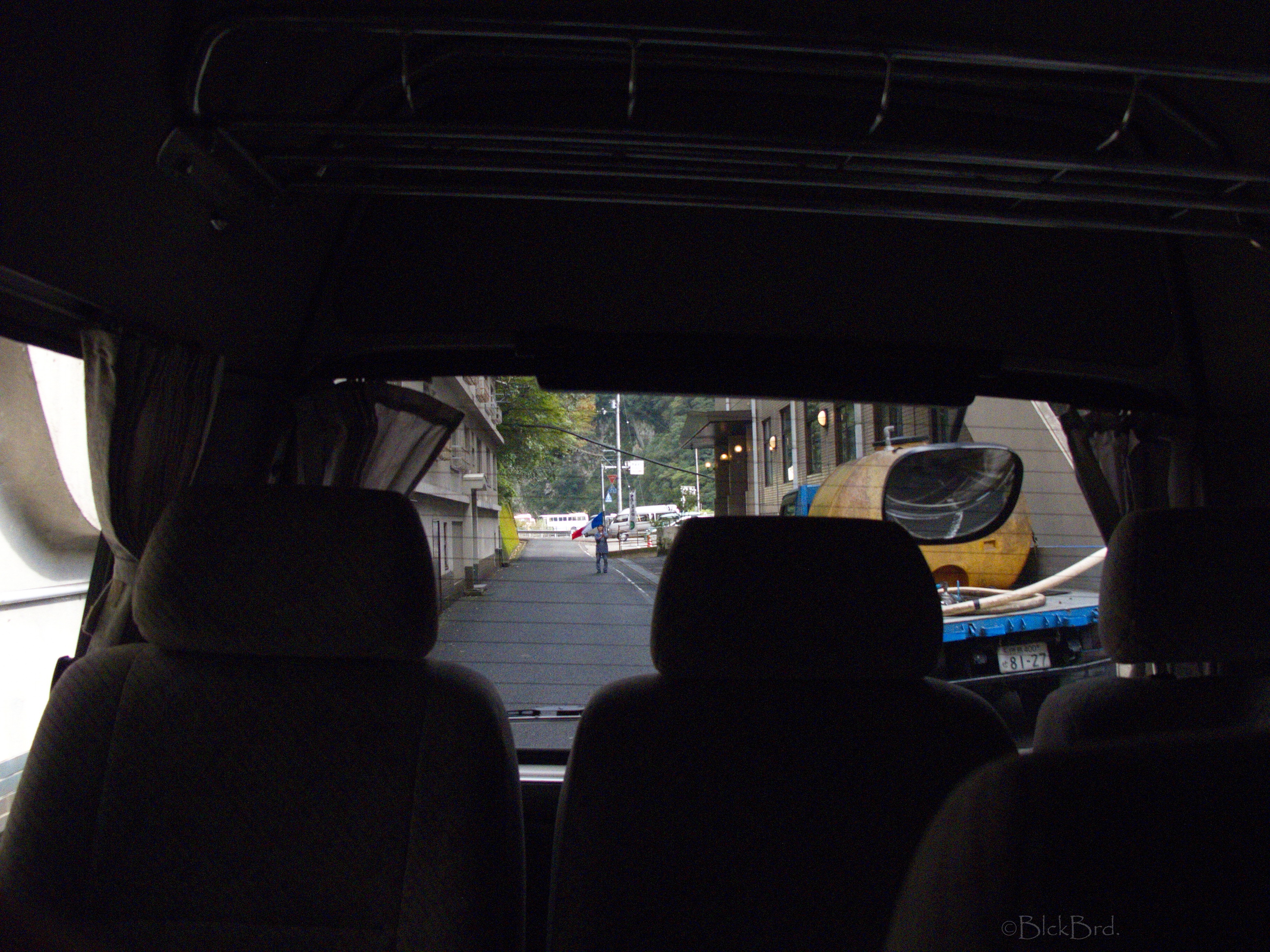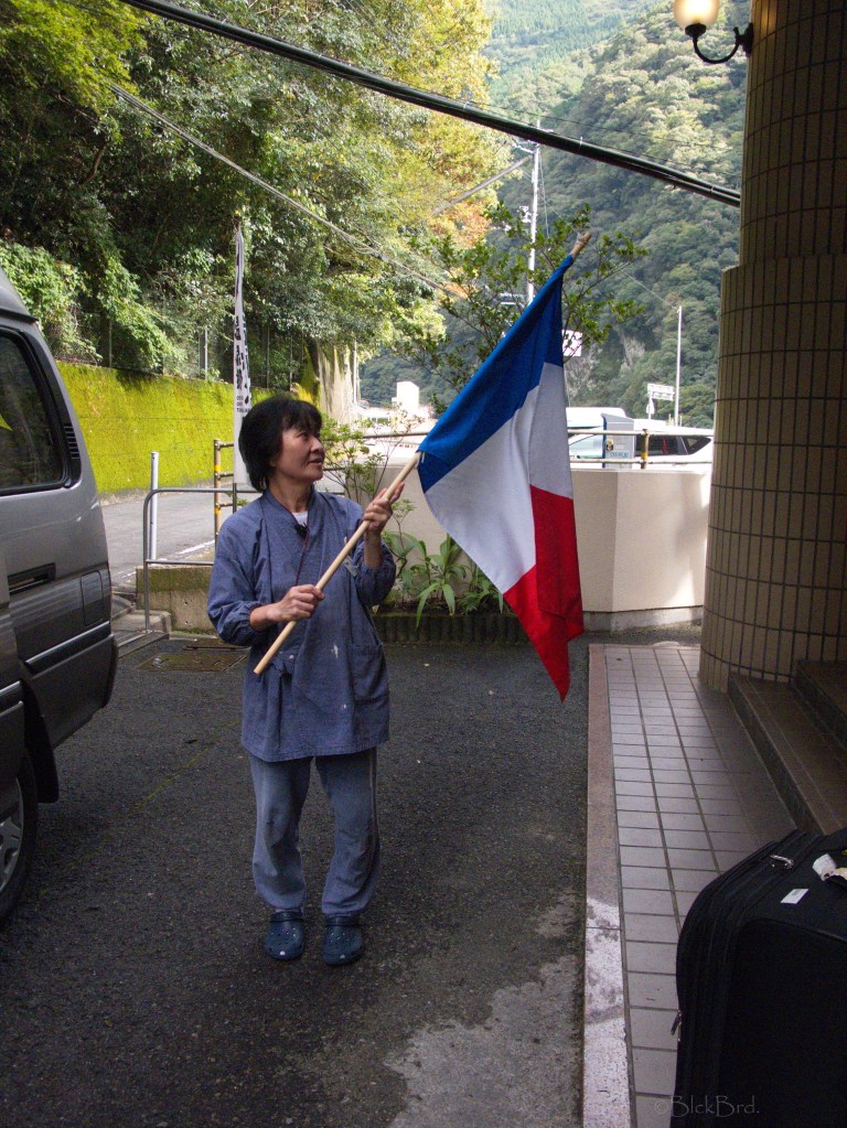 D’abord les adieux du personnel du ryokan……….. une dame agite avec grande conviction un drapeau français jusqu’à ce que notre véhicule navette soit hors de vue… Je croyais qu’au Japon, ne pas mettre l’autre dans l’embarras était une base de la politesse, à chaque fois ça me met grave mal à l’aise ce genre de trucs, je prie tellement fort pour être ailleurs…