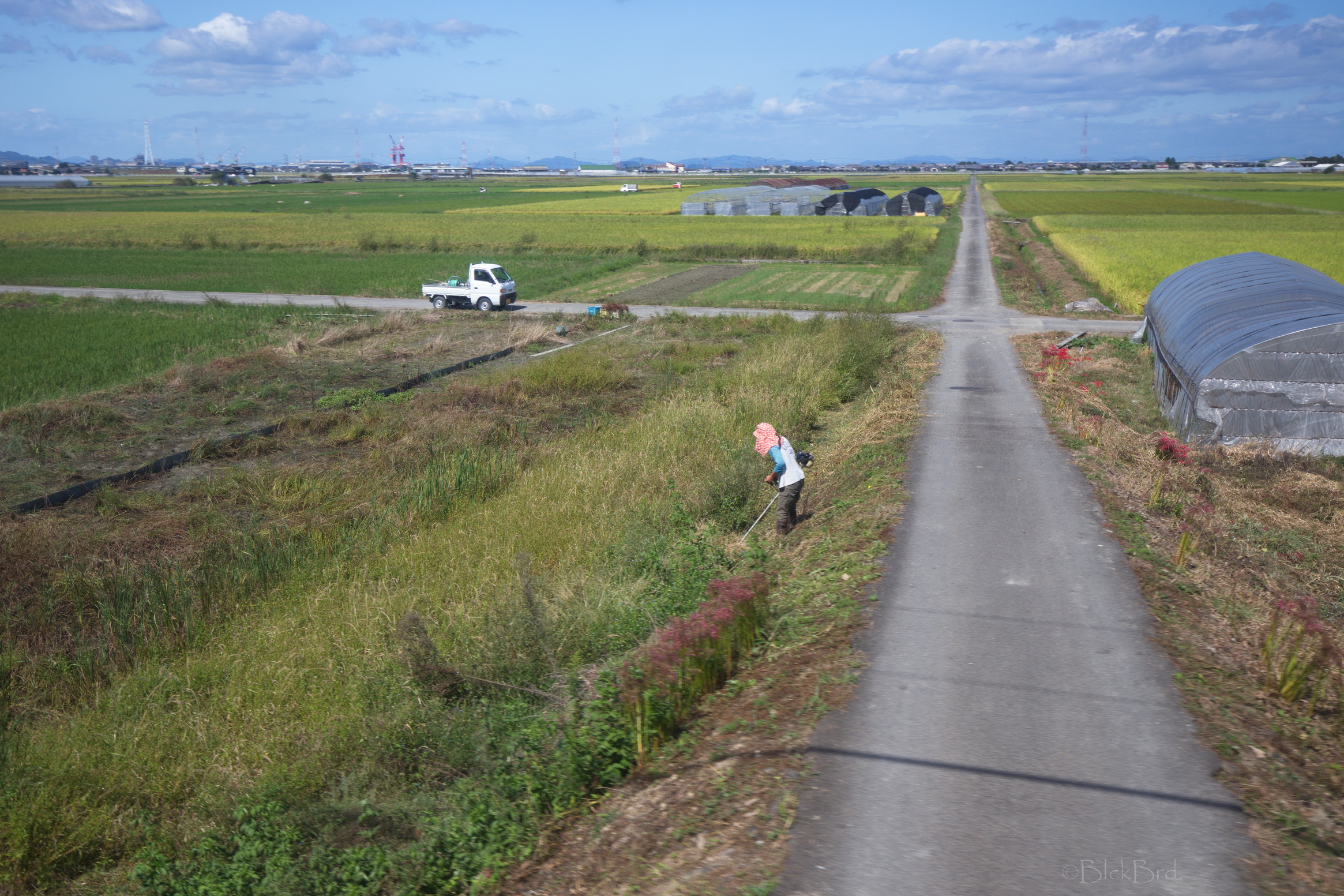 Arrivés à l’arrêt de bus de Hakatajima, on se pose 5mn sur un banc, le temps de faire le point sur la direction à prendre. On sait qu’on a environ 2km à faire à pied. « Totalement déshydratée », je m’ouvre une grande canette de Kirin.